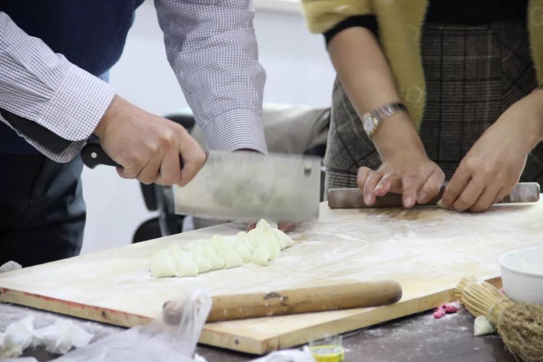 团建活动中,大家一起擀皮、和馅,忙得不亦乐乎。灵巧的双手之间,一个个饱满的水饺就已经包好啦。