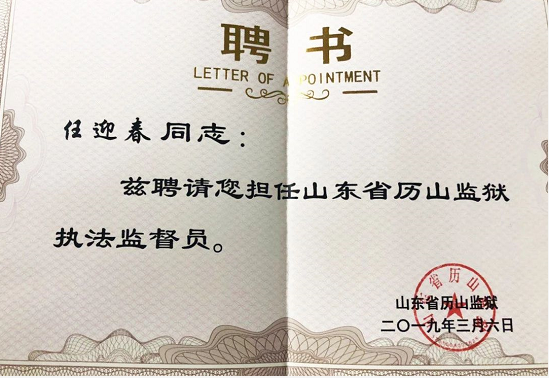 任迎春表示,此次被山东省历山监狱聘任为首批执法监督员是省法律援助中心领导的一份信任,更是一份责任。未来,会及时了解、监督监狱执法工作,切实维护服刑人员合法权益,助力监狱法治建设向更高层次发展,为法治山东建设贡献智慧和力量。