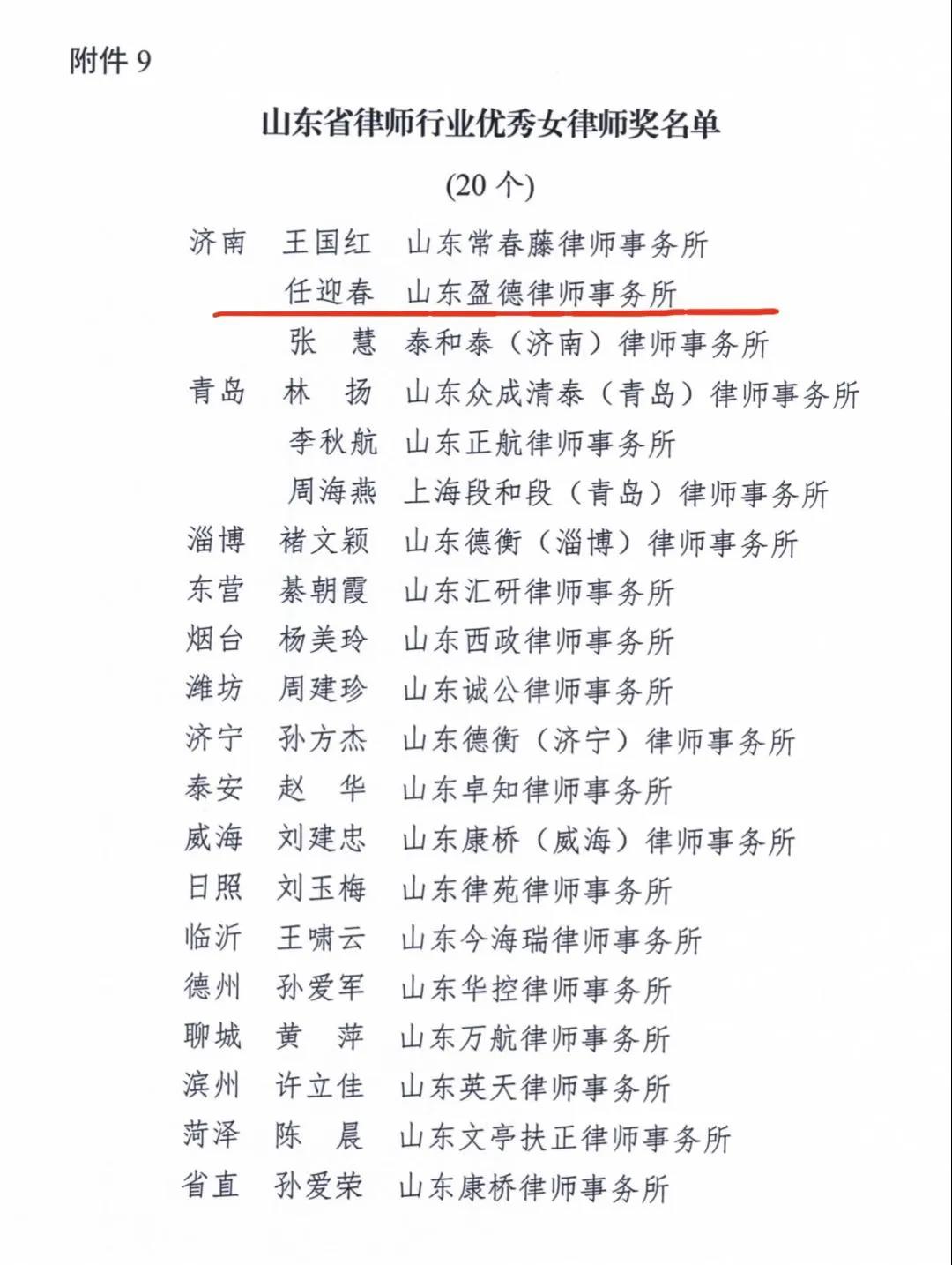 为表彰先进、弘扬正气,激励各级律师行业党组织、党员律师、党务工作者和广大律师履职尽责、再创佳绩,近日,省律师行业党委下发了《关于表彰山东律师行业先进党组织、优秀党员、党务工作者及优秀律师的决定》,我所任迎春律师被授予“山东省律师行业优秀女律师”荣誉称号。