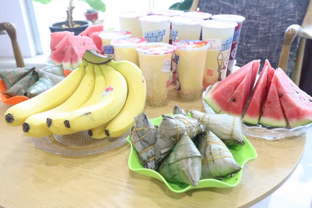 热气腾腾的粽子,汁甜肉脆的水果,清爽解腻的果茶。