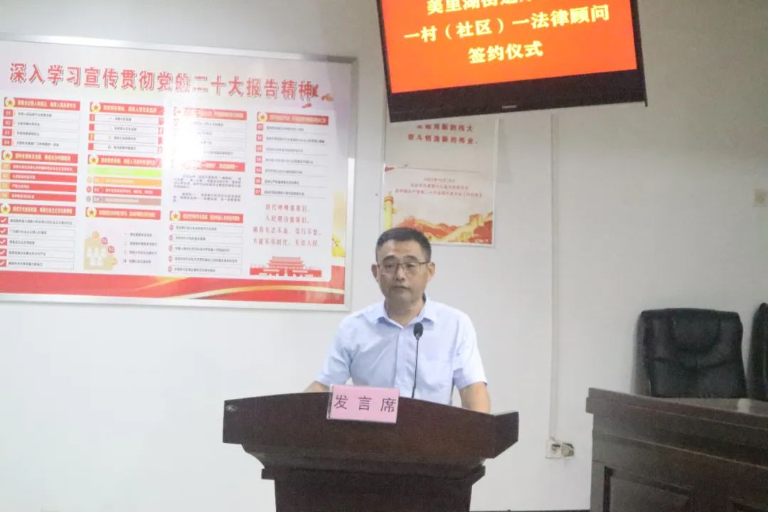为积极践行槐荫区委、区政府关于“一村(社区)一法律顾问”工作的要求和精神 ,深入开展村居(社区)群众身边的法律服务工作,8月14日下午,美里湖街道举行一村(社区)一法律顾问签约仪式。槐荫区司法局党组成员、三级调研员王士勇,美里湖街道党工委副书记、人大工作室主任苗晓峰,美里湖街道办事处副主任田斌,美里湖司法所所长刘学著,各村居书记,山东盈德律师事务所党支部书记马风记及服务各村居律师参加活动。