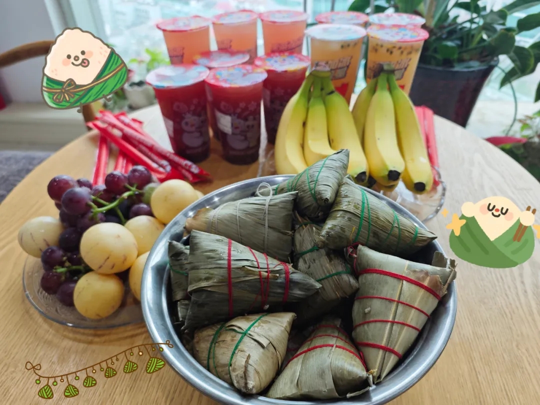 热气腾腾的粽子,饱满汁甜的水果,清爽解腻的果茶。