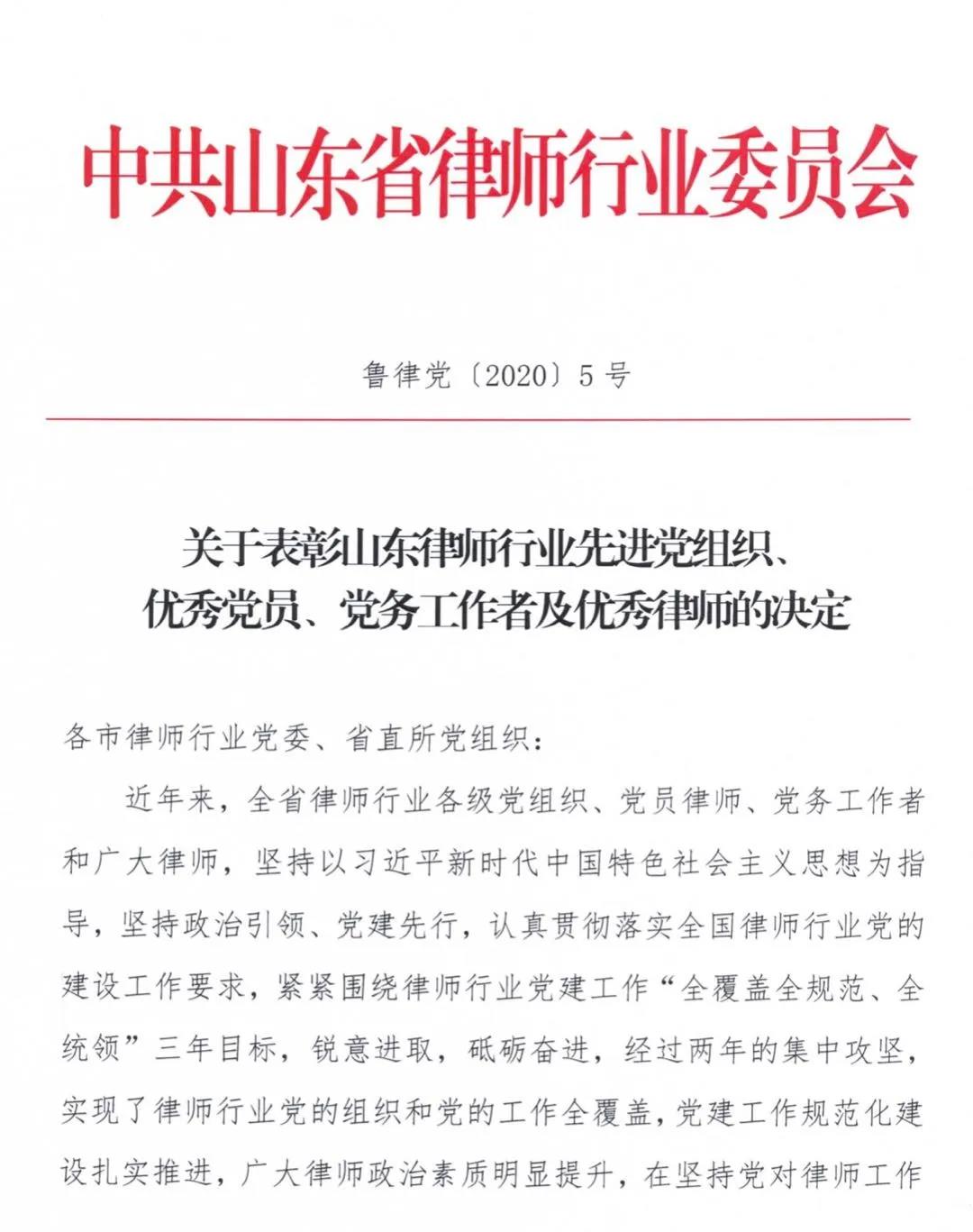 为表彰先进、弘扬正气,激励各级律师行业党组织、党员律师、党务工作者和广大律师履职尽责、再创佳绩,近日,省律师行业党委下发了《关于表彰山东律师行业先进党组织、优秀党员、党务工作者及优秀律师的决定》,我所任迎春律师被授予“山东省律师行业优秀女律师”荣誉称号。