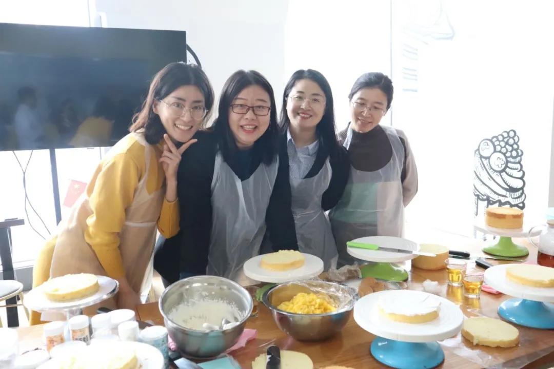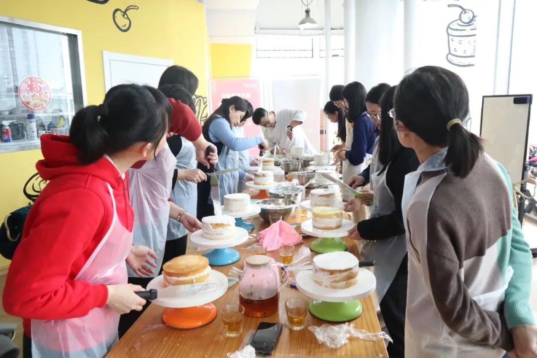 在专业烘焙老师的带领下,人人都专心、细心地学习和操作。从做蛋糕前的准备到蛋胚的摆放,奶油的涂抹,再到最后的造型装饰,大家现学现做,一双双灵巧的手制作出一个个独具匠心的蛋糕。