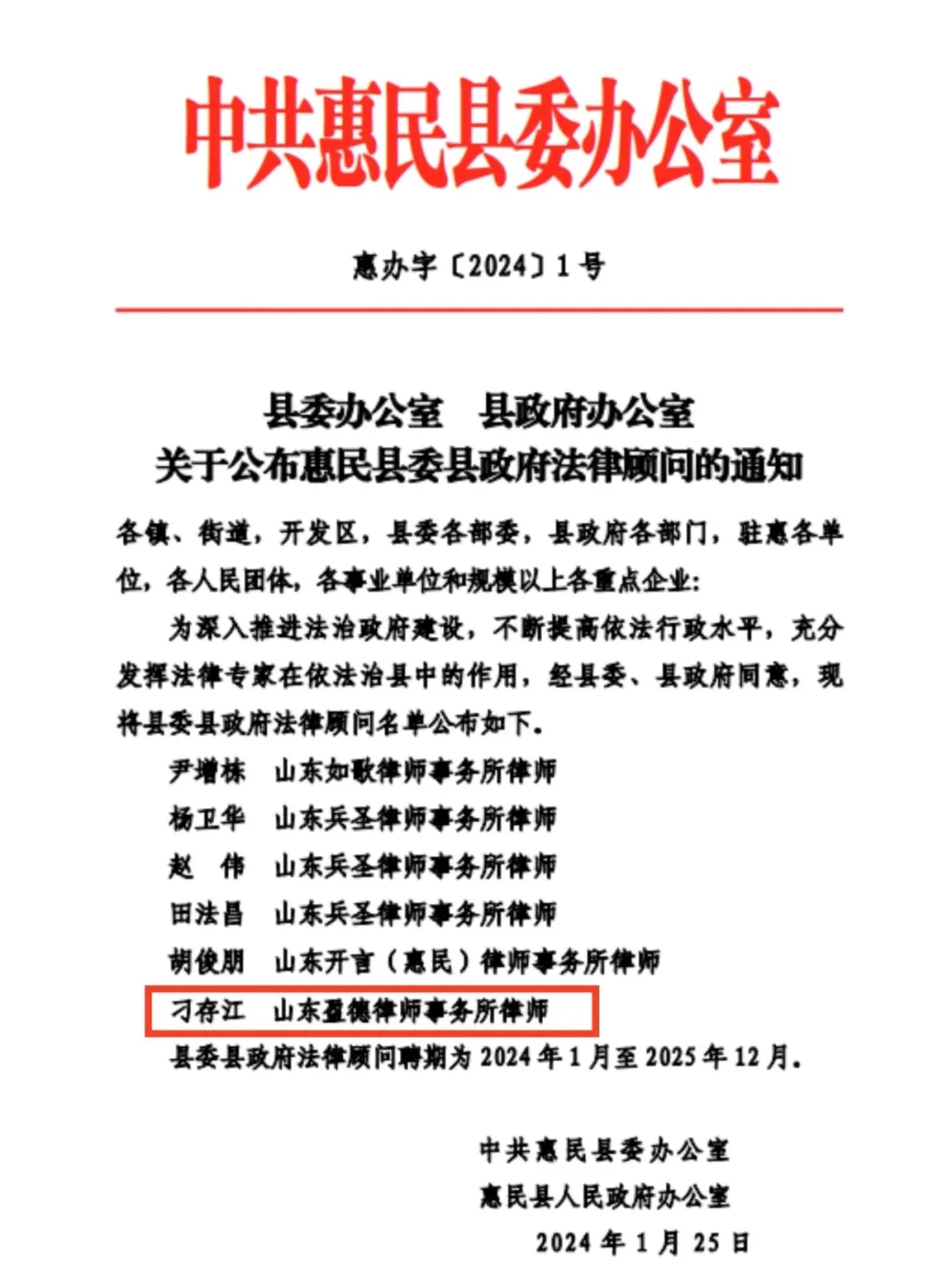 为深入推进法治政府建设,不断提高依法行政水平,充分发挥法律专家在依法治县中的作用。近日,惠民县委、县政府公布法律顾问名单,共有20位律师受聘担任,我所刁存江主任位列其中。